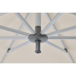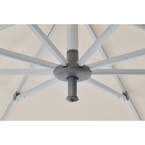 L'armature du parasol est composée de 8 baleines en aluminium, disponibles en deux options de coloris : anodisé naturel ou peint par poudrage en gris anthracite (RAL7016). Le profil du mât est de Ø.55 cm avec une épaisseur de 2,5 mm, également disponible en deux options de coloris.