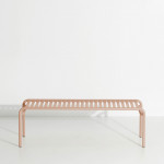 La collection WEEK-END est une gamme de mobilier outdoor complète. Pensée pour une utilisation pratique, les éléments sont empilables. La forme ovale et cernée dessine les dossiers pour qu'ils deviennent un signe graphique. Le travail des lattes horizontales et verticales comme des rayures, souligne les pleins et les vides, affirmant l'identité de la collection.