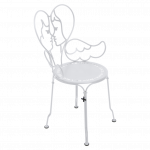 Revisite de la chaise 1900, référence emblématique du catalogue Fermob. Il nous offre le baiser de deux angelots et un poème entre Cocteau et Saint Exupéry. Le désigner nous