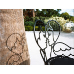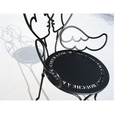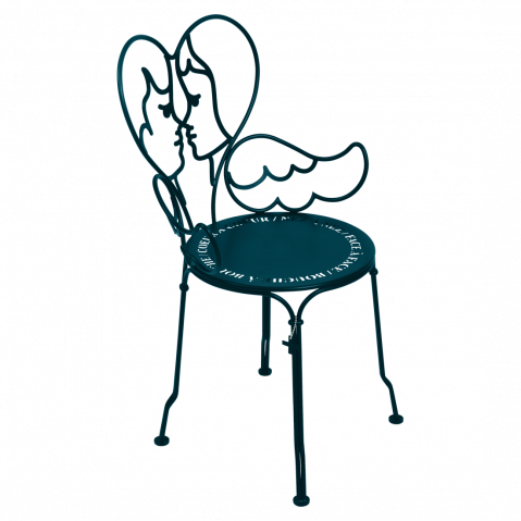Revisite de la chaise 1900, référence emblématique du catalogue Fermob. Il nous offre le baiser de deux angelots et un poème entre Cocteau et Saint Exupéry. Le désigner nous