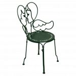 Revisite de la chaise 1900, référence emblématique du catalogue Fermob. Il nous offre le baiser de deux angelots et un poème entre Cocteau et Saint Exupéry. Le désigner nous