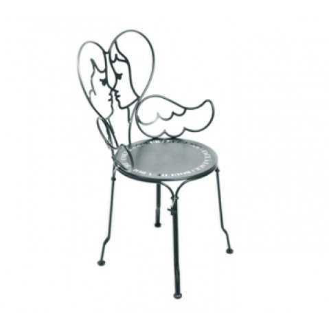Revisite de la chaise 1900, référence emblématique du catalogue Fermob. Il nous offre le baiser de deux angelots et un poème entre Cocteau et Saint Exupéry. Le désigner nous