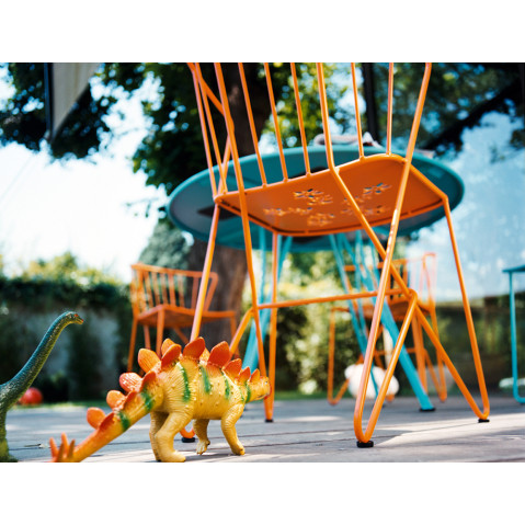 Guéridon : plateau plein tôle acier démontable, piètement fil acier.
