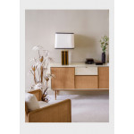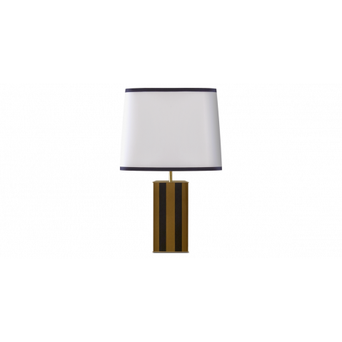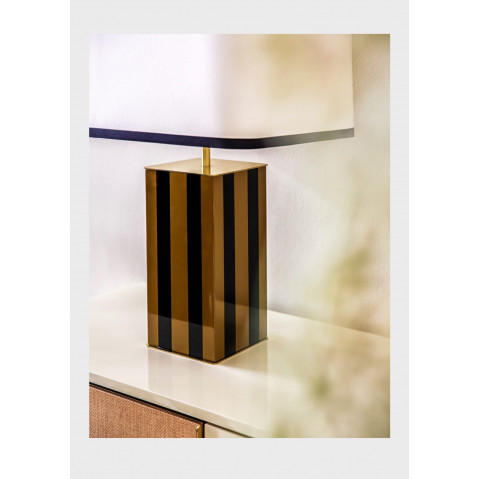 La lampe Élysée de Red Edition se veut majestueuse et géométrique dans ses volumes, sur un socle massif laqué bicolore bordé de laiton et un abat jour en tissu lin et revêtement en coton noir.