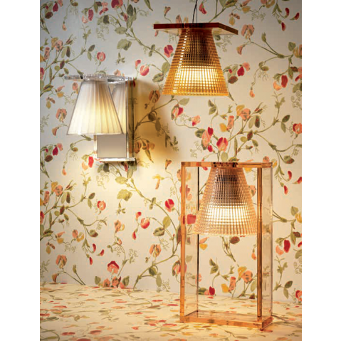 Caractérisée par des lignes très graphiques, sa structure se compose d’un cadre rectangulaire en techno-polymère thermoplastique transparent ou teinté dans la masse qui accueille le diffuseur, une parabole conique sculptée dont l'intérieur est en tissu plissé.